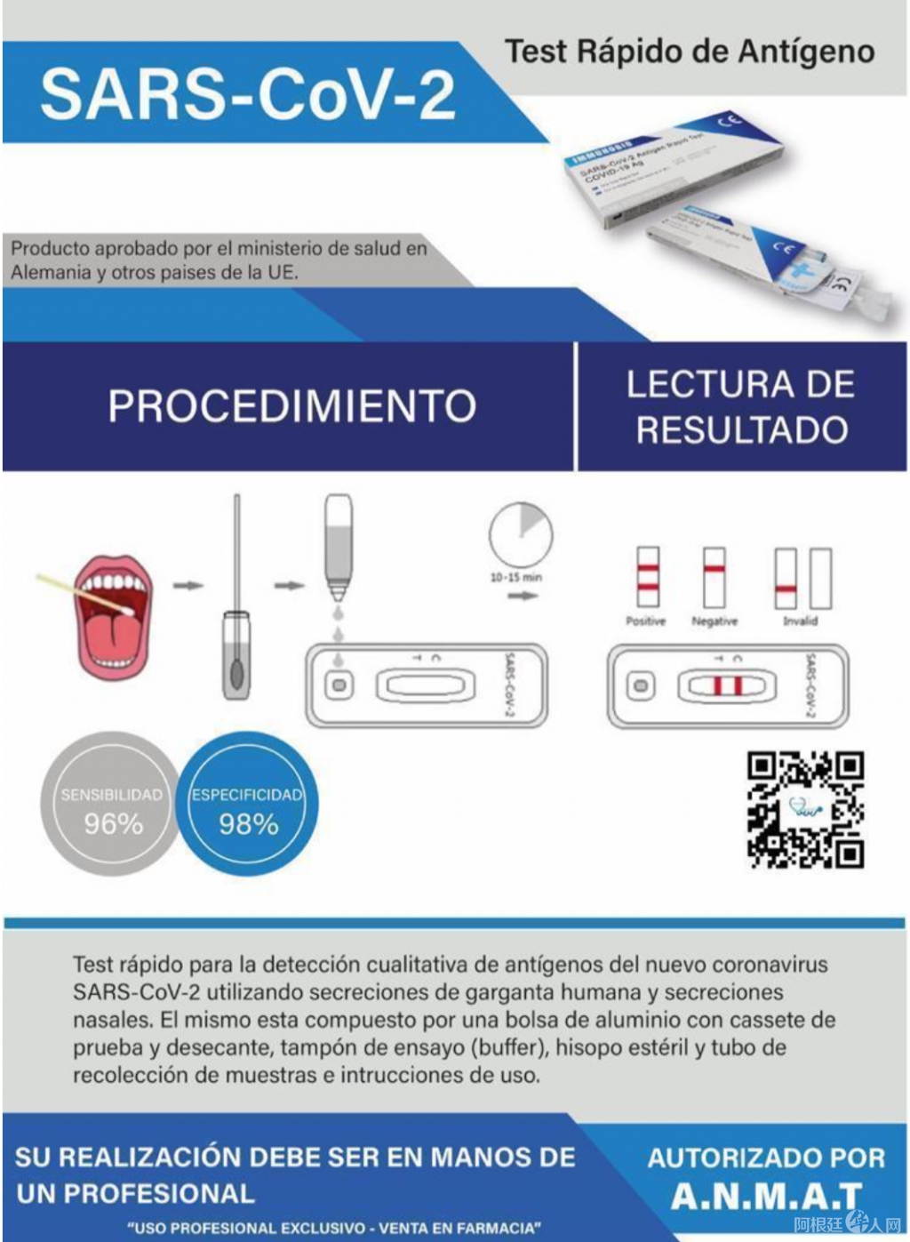 (阿根廷华人网4月14日讯/Andres)本周三,一种快速核酸检测拭子经阿根廷食药监局批准后上市,人们可以在各大药房自行购买,但拭子须由一名专业的医护人员操作使用。