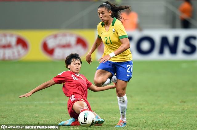 腾讯体育12月19日讯 北京时间8时,2014巴西女足四国邀请赛末轮,中国队以1-4惨败给巴西队。第13分钟大达莲娜为巴西打破僵局,第24分钟安德雷希妮亚扩大战果,第59分钟 古雅沙则遭到红牌逐出,第61分钟德比尼娅继续扩大比分,第65分钟阿尔维斯(微博 数据) 攻入锁定胜局入球,补时阶段任桂辛为中国队攻入挽回颜面的一球。