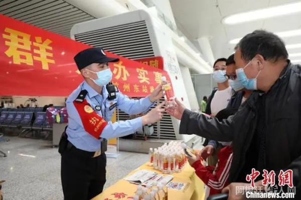 资料图:民警向旅客赠送印有反诈口诀的矿泉水。 韦士钊 摄
