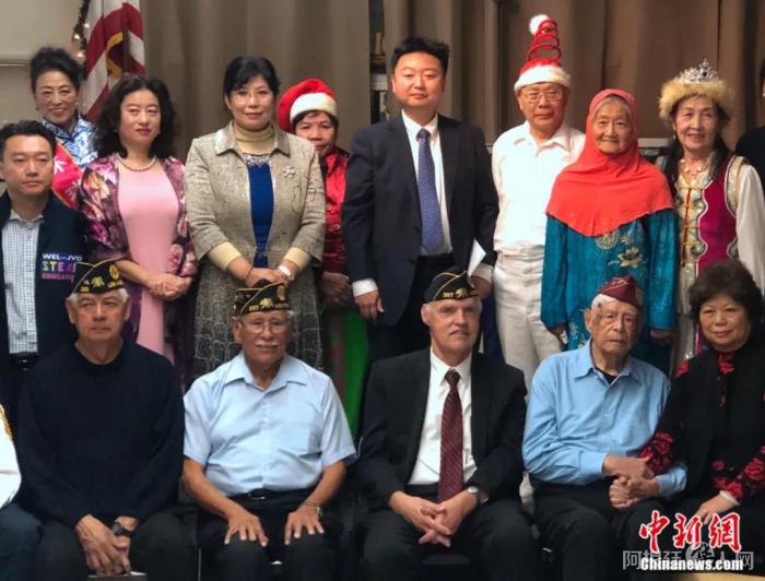 资料图:2018年12月22日,美国北京联合会等南加州华人团体来到位于大洛杉矶地区蒙特利公园市的美国退伍军人协会,慰问百岁高龄的二战英雄桑切斯等美国退伍军人并赠送圣诞节礼物。中新社记者 张朔 摄