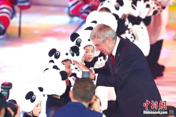 资料图:2020年9月17日,北京2022年冬奥会吉祥物和冬残奥会吉祥物发布活动在北京举行。图为国际奥委会主席巴赫在发布活动上与小演员互动。中新社记者 富田 摄