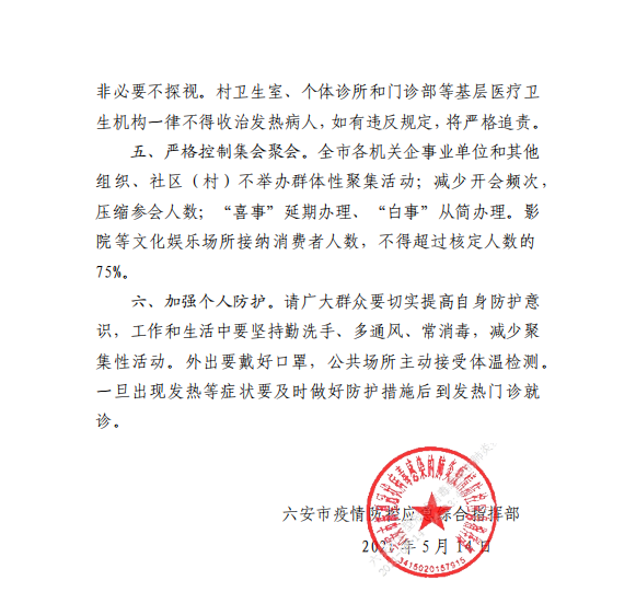 记者从安徽省六安市新型冠状病毒肺炎疫情防控应急综合指挥部获悉,根据国务院应对新冠肺炎疫情联防联控机制和省疫情防控指挥部办公室有关规定,结合当前疫情形势,经市新冠肺炎疫情防控应急指挥部研究决定,自2021年5月14日起,六安市启动新冠肺炎疫情控制应急预案。