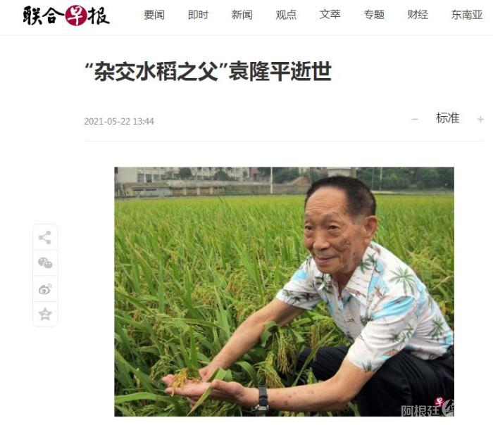 新加坡《联合早报》除了报道袁隆平逝世的消息,还在其官网发布了一段回顾袁隆平生前的珍贵影像。