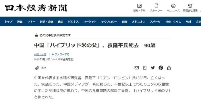 《日本经济新闻》称,半个多世纪以来,袁隆平为提高稻米产量而进行品种改良,为解决中国粮食问题作出了贡献。