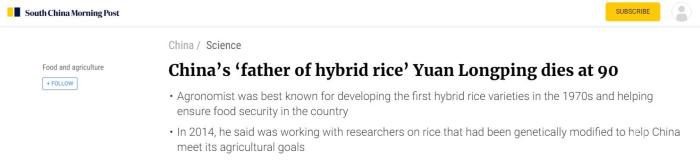 《南华早报》写道,“杂交水稻之父”袁隆平在20世纪70年代研发了首批杂交水稻品种,并帮助确保了中国的粮食安全。