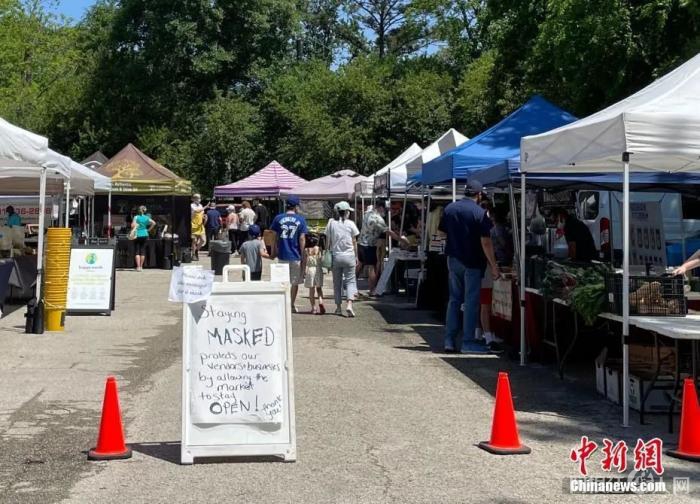 资料图:当地时间2021年4月24日,美国休斯敦市“纪念村”社区的“周六农贸集市”入口的告示板上,写着“为保障农贸集市开门营业,请戴口罩以保护商户安全 ”。中新社记者 曾静宁 摄