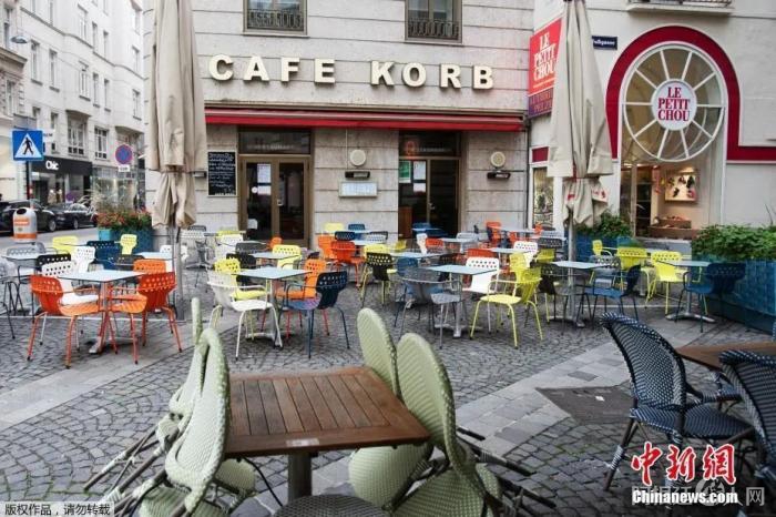 资料图:当地时间2020年11月3日,奥地利维也纳市中心餐馆的露台上桌椅空置。