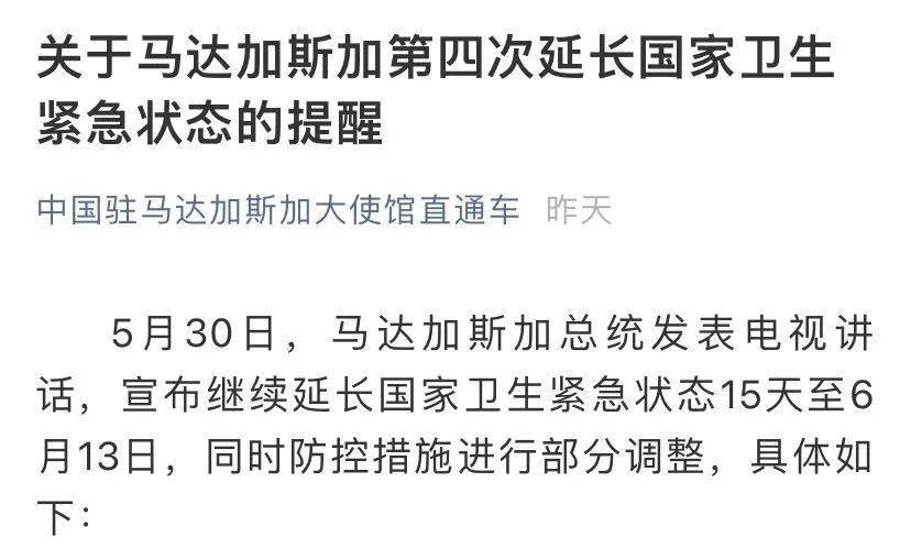 5月30日,马达加斯加总统发表电视讲话,宣布继续延长国家卫生紧急状态15天至6月13日,同时防控措施进行部分调整: