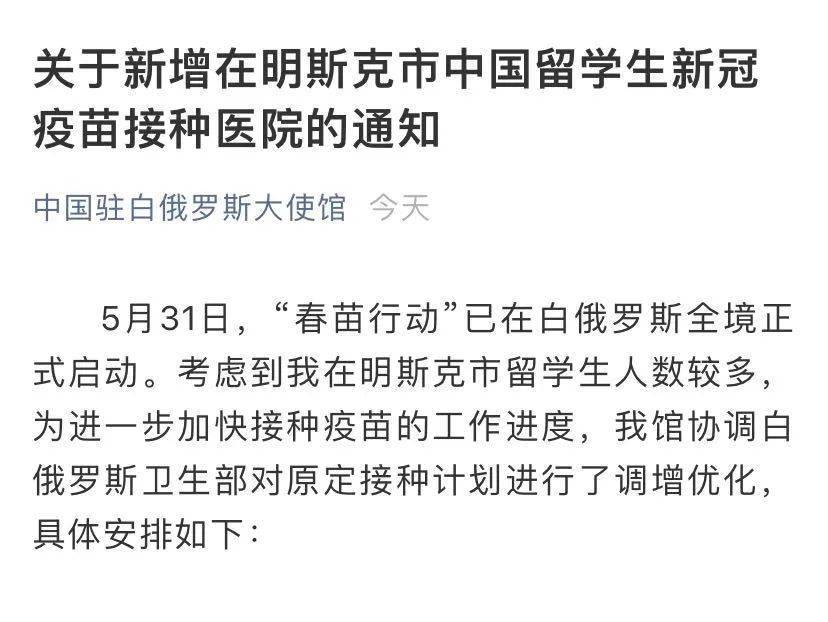 考虑到中国在明斯克市的留学生人数较多,驻白俄罗斯大使馆协调白俄罗斯卫生部对原定接种计划进行了调增优化:
