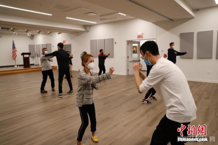 当地时间4月25日,美国纽约法拉盛亚裔社区自发成立的“公共安全巡逻队”队员以及部分民众,在该社区活动中心进行防卫术训练,提高安防能力。中新社记者 廖攀 摄