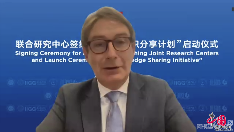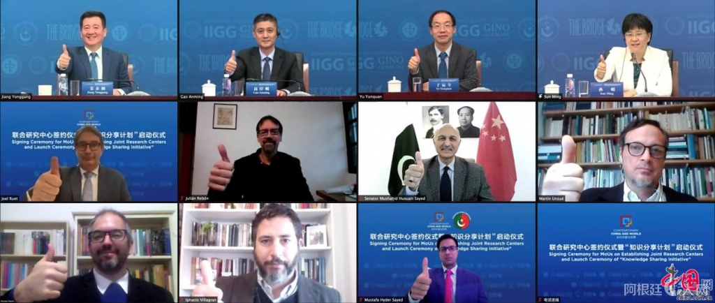 今日,中国外文局当代中国与世界研究院与阿根廷布宜诺斯艾利斯大学吉诺·赫尔玛尼研究所、巴基斯坦巴中学会、法国桥智库举行在线签约仪式,成立三家“当代中国与世界”联合研究中心,并启动“当代中国与世界知识分享计划”。中国外文局副局长兼总编辑高岸明出席活动并致辞。