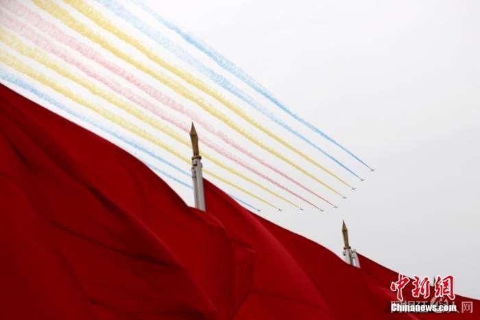 7月1日上午,庆祝中国共产党成立100周年大会在北京天安门广场隆重举行。图为大会开始前的飞行庆祝表演。 中新社记者 盛佳鹏 摄