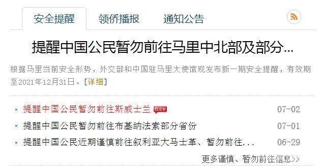 近日,中国领事服务网更新了多个安全提醒,提醒中国公民暂勿前往斯威士兰、马里中北部及部分边境地区和布基纳法索部分省份。