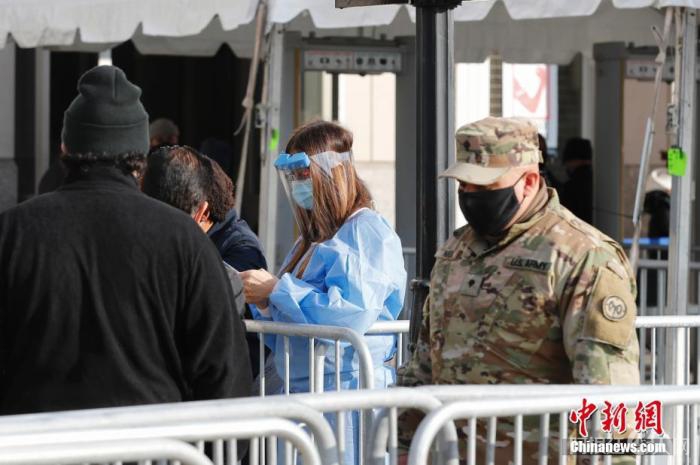 资料图:纽约洋基球场新冠疫苗接种点工作人员接待市民。中新社记者 廖攀 摄