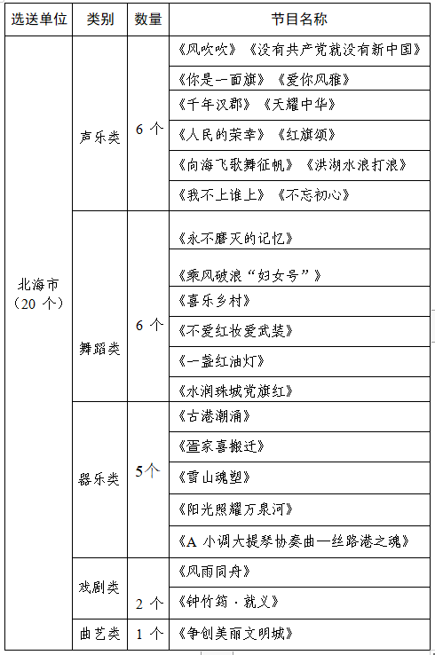 此前,北海市通过组织各县区和有关单位选送优秀文艺节目,并以会演选拔的方式选取了部分优秀节目推送自治区党委宣传部参加复选,有20个节目进入决赛,其中包括舞蹈《永不磨灭的记忆》和合唱《风吹吹》《没有共产党就没有新中国》。
