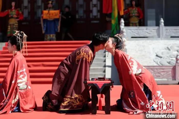 资料图:一对情侣身着唐装在仿唐婚典仪式现场。 张远 摄