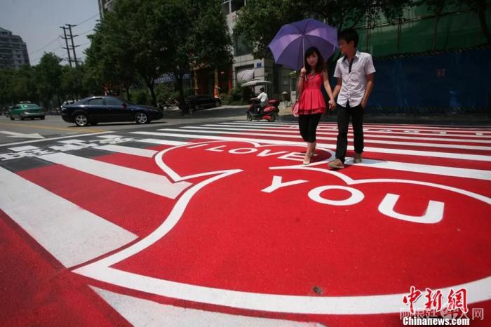 资料图:一对恋人走过成都街头的“爱情斑马线”。张浪 摄