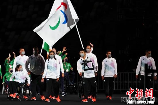 8月24日,2020东京残奥会开幕式在东京新国立竞技场举行。图为东京残奥会难民代表团步入场内。