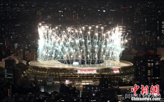 8月24日,2020东京残奥会开幕式在东京新国立竞技场举行。图为体育场上空烟花绽放。