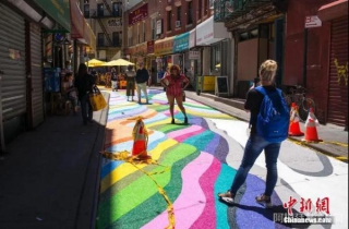当地时间6月23日,美国纽约曼哈顿中国城宰也街的彩绘路面吸引众多游客驻足。中新社记者 廖攀 摄
