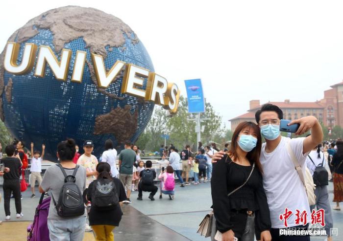 9月5日,游客在北京环球度假区的标志性景观前拍照留影。 中新社记者 易海菲 摄