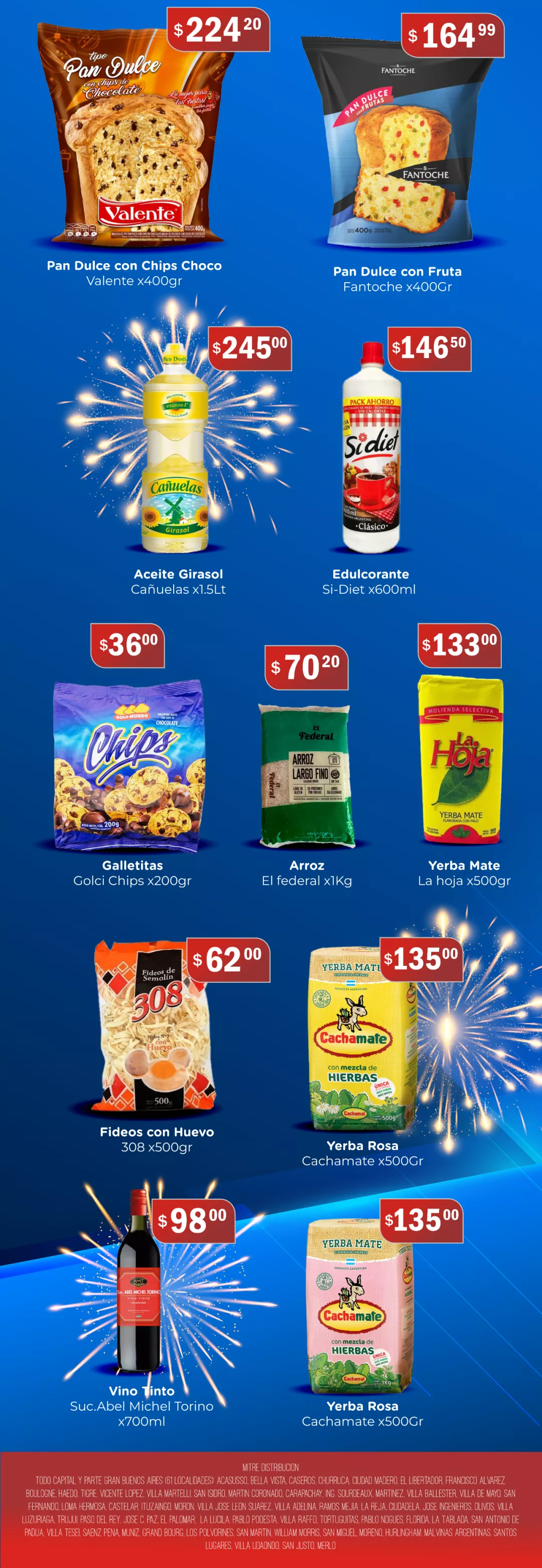 特价圣诞食品包括:甜面包、苹果酒、甜味剂、葵花籽油、米、马黛茶、薯片、巧克力等近百种。价格优惠,数量有限,购买从速。