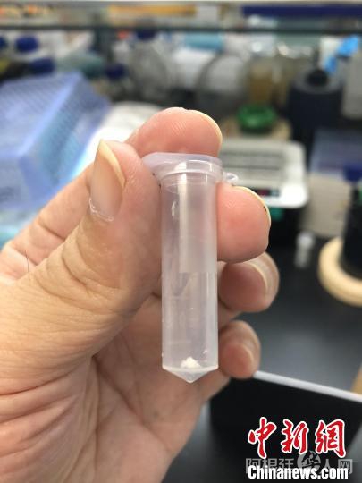 中科院天津工业生物技术研究所蔡韬副研究员在实验室展示人工合成淀粉样品。 中科院科技摄影联盟 供图