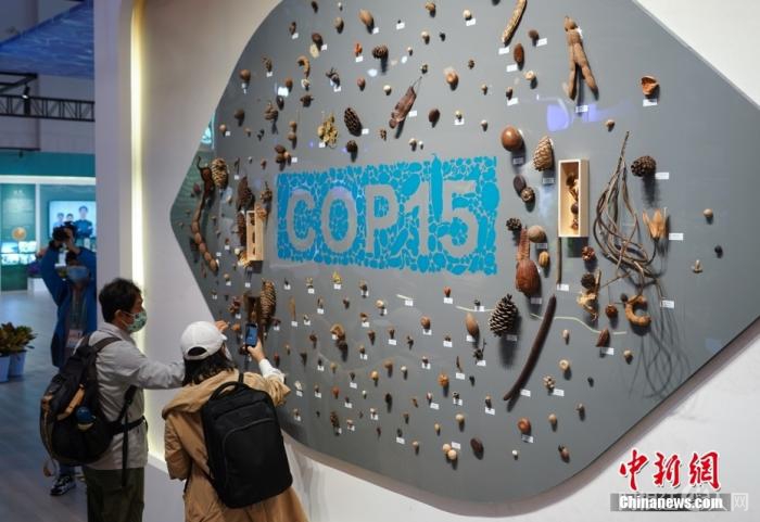 10月12日,云南昆明,联合国《生物多样性公约》第十五次缔约方大会与会嘉宾参观云南生物多样性保护实践与成果展。图为嘉宾观看展出的COP15种子墙。 中新社记者 崔楠 摄