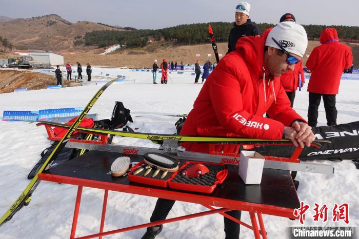 冬季两项国家集训队主教练比约达伦赛前为队员的滑雪板涂蜡 郝凌宇 摄