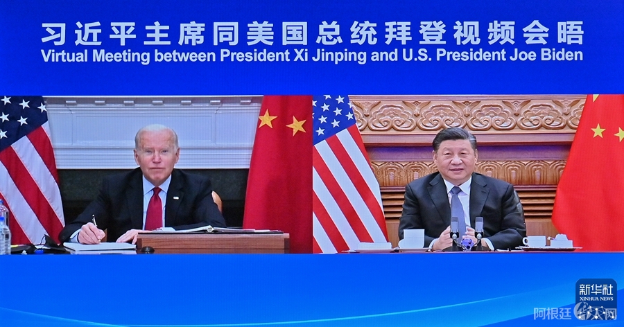 11月16日上午,国家主席习近平在北京同美国总统拜登举行视频会晤。新华社记者 岳月伟 摄