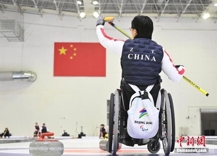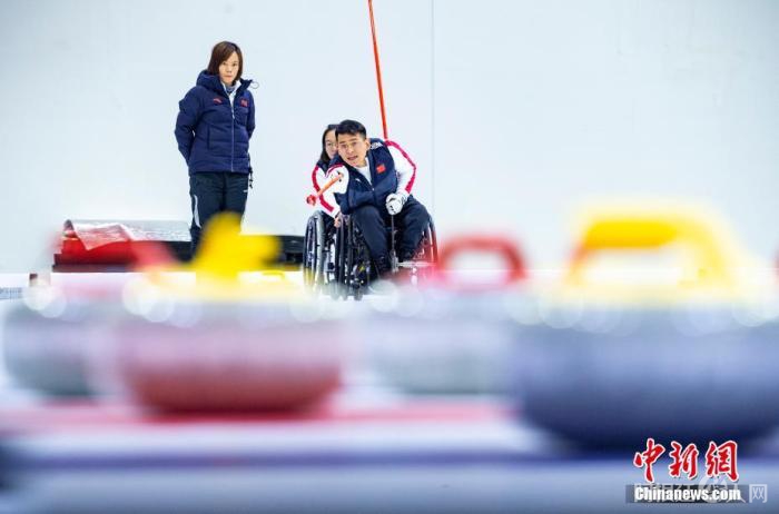 11月22日,中新社记者前往位于北京市顺义区的中国残疾人奥林匹克运动管理中心,探访中国轮椅冰壶队在此备战北京2022年冬残奥会的情况。图为中国队队员调整冰刷。 中新社记者 侯宇 摄