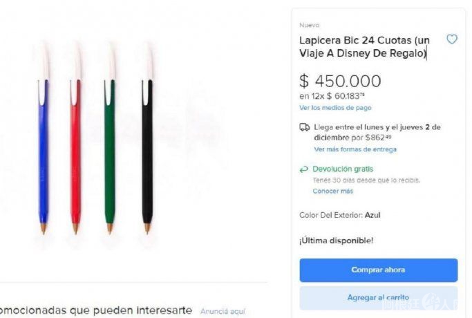 俗话说:“上有政策,下有对策。”就在这一话题不断升温时,有民众发现在阿根廷电商网站mercadolibre上出现了一件不寻常的商品,其配图为四只Bic牌圆珠笔,标题为“可24期支付的Bic圆珠笔(另附赠一趟迪士尼之旅)”,其售价更是惊人地高至45万比索。