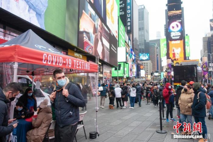 当地时间12月29日,美国纽约,民众在时报广场的一处新冠病毒检测点排队检测。近日,纽约市新冠肺炎确诊病例激增,该市新冠病毒检测需求高涨,不少检测点大排长龙。 中新社记者 王帆 摄