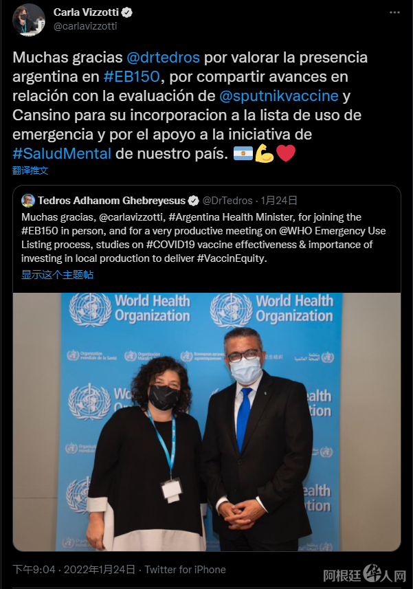 而维佐蒂则转发了这条推文,并附文称:“非常感谢谭德赛先生能赏识我在#EB150会上的发言,感谢他在会上分享的正在将@人造卫星V号疫苗以及康希诺疫苗加入世卫组织紧急情况物品使用清单的相关进展,同时感谢他对我们国家倡导关注#精神健康的支持”。