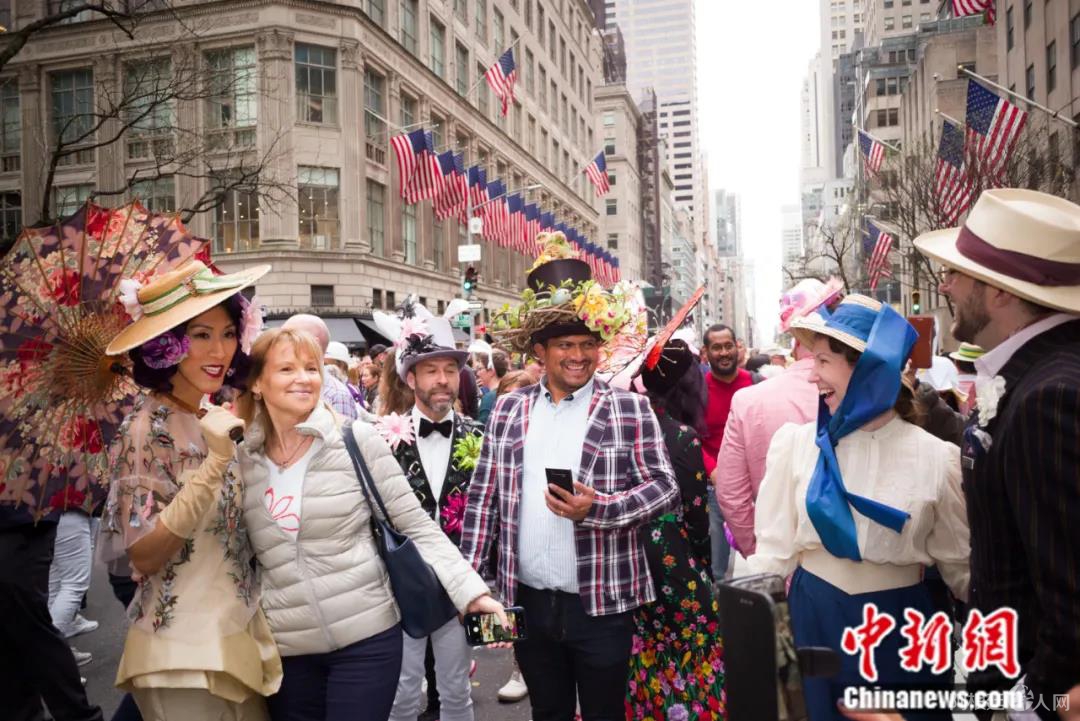 2019年4月,人们头戴精心制作的花帽,在纽约第五大道参加一年一度的复活节游行。中新社记者 廖攀 摄