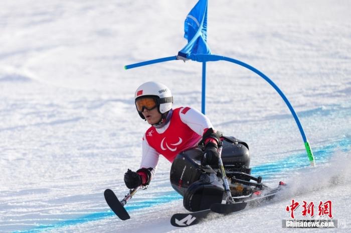 3月10日,中国选手梁子路比赛中。当日,北京2022年冬残奥会残奥高山滑雪男子大回转-坐姿决赛在延庆国家高山滑雪中心举行,中国选手梁子路以2分00秒92的成绩摘得铜牌。 中新社记者 杨华峰 摄