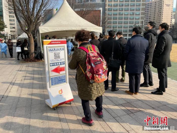 当地时间1月26日,在位于韩国首尔市厅门前的检测点外,民众排队进行核酸检测。 中新社记者 刘旭 摄