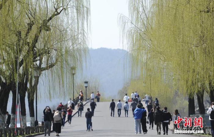 图为西湖白堤柳枝呈现嫩绿色。 王刚 摄