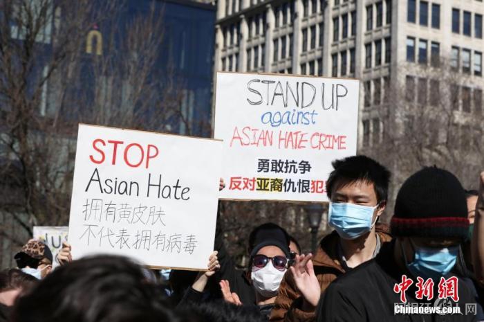 资料图:2021年3月21日,千余名纽约市民在曼哈顿联合广场集会示威,抗议针对美国亚裔的种族歧视和仇恨犯罪。图为示威者在现场高举用中英双语书写的标语牌。 中新社记者 马德林 摄