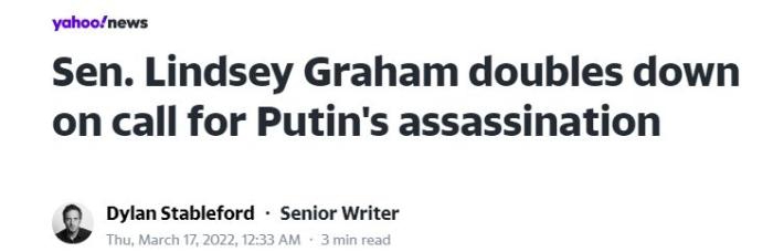 “我希望他(普京)会以某种方式被淘汰出局”,“我不在乎他们怎么把他带走,我不在乎我们是否把他送到海牙试试。”格雷厄姆表示。据报道,格雷厄姆认为,刺杀普京是罢免俄总统的“理想选择”,他对此表示呼吁。