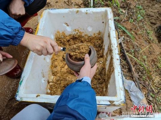 乘客家属使用陶罐带现场泥土回家。中新社记者 王以照 摄