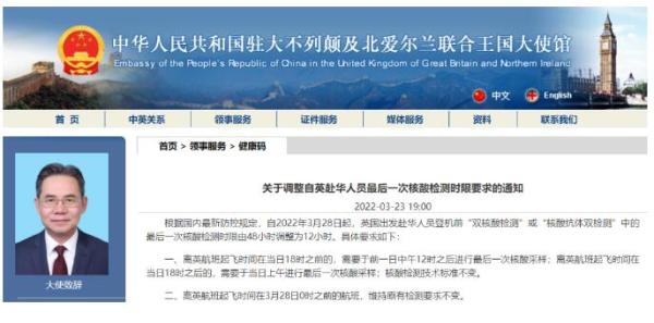 以英国为例,中使馆通知:自2022年3月28日起,英国出发赴华人员登机前“双核酸检测”或“核酸抗体双检测”中的最后一次核酸检测时限由48小时调整为12小时。