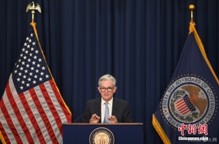 图为美联储主席鲍威尔当天在货币政策例会后出席记者会。 中新社记者 陈孟统 摄