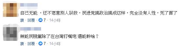 此番言论在岛内引发热议。大量网友在社交平台发表留言痛批民进党当局:“没能力救人也不让有能力的救。”“自己救不了人,人民找大陆求救,还要骂人摆谱?丢脸。”“自己无能,还不愿意别人获救,民进党搞政治搞成这样,完全没有人性。”“早看破他们执政的能耐,一张嘴巴拉巴拉胡乱骗,撒钱捞钱。”