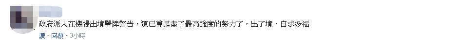 同时,有网友对民进党当局的无能展开花式嘲讽:“(民进党)政府派人在机场出境举牌警告,这已算是尽了最高强度的努力了,出了境,自求多福。”“无能的民进党只会用扫把和石头‘抗中保台’,其它的废物。”
