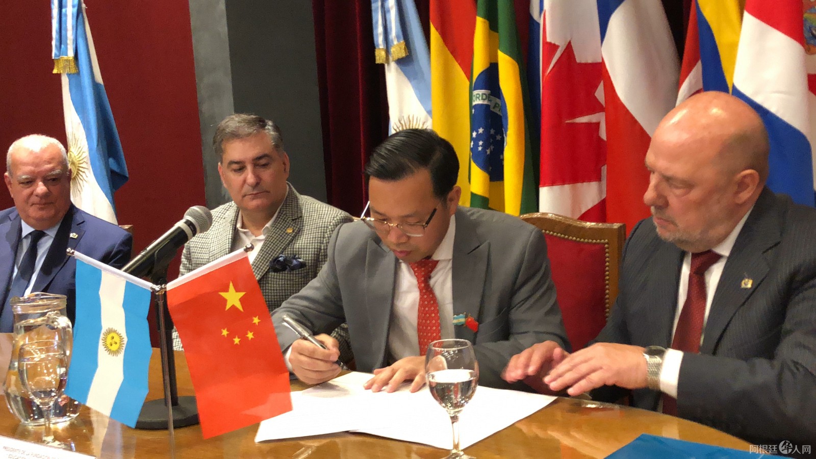 阿根廷联邦警察大学研究院院长利奥波德·费边·维达尔先生和阿根廷华文教育基金会会长刘芳勇代表中阿双方签署协议。