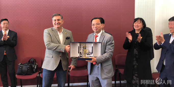 阿根廷联邦警察总局局长胡安·卡洛斯·埃尔纳德斯先生向阿根廷华文教育基金会会长刘芳勇赠送了纪念品。