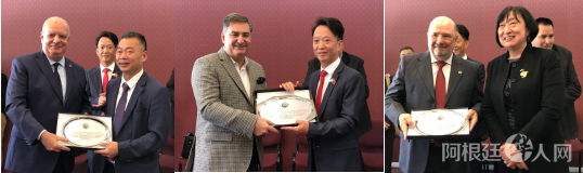 阿根廷华助中心主任严祥兴、阿根廷妇女儿童联合会会长陈静和阿根廷华人进出口商会会长薛文强分别向阿根廷联邦警察总局局长胡安·卡洛斯·埃尔纳德斯先生、阿根廷联邦警察总局总专员鲁本·雷蒙迪先生和阿根廷联邦警察大学研究院院长利奥波德·费边·维达尔先生赠送了由阿根廷华文教育基金会准备的纪念品。