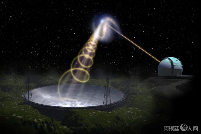 快速射电暴和宿主星系艺术想象图。中国天眼(左)和美国凯克望远镜(右)承担本次研究观测。 喻京川、傅海 绘图