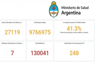 自疫情以来,阿根廷累计确诊9766975例新冠确诊病例,累计死亡130041例。目前全国重症病床的占用率为41.3%。